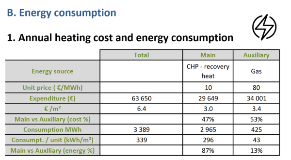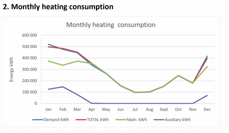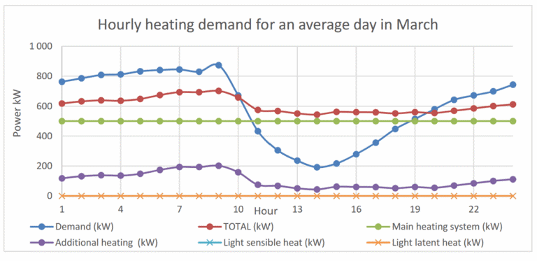 La nuit et le matin, une grande partie des besoins en chauffage est couverte par le système de récupération de chaleur du centre de données (système de chauffage principal, pour 500 kW). Le reste des besoins en chauffage nécessite l’utilisation d’un chauffage supplémentaire.